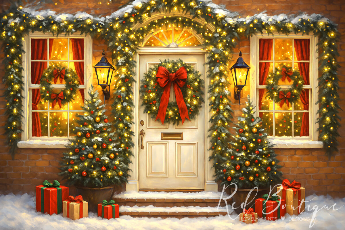 Fundal foto White Christmas Entry pentru ședințe foto de Crăciun cu un decor clasic și festiv. Intrarea este decorată cu o coroniță mare cu fundă roșie, brazi împodobiți cu globuri aurii și roșii, ghirlande cu luminițe calde și cadouri colorate. Atmosfera este caldă și primitoare, amintind de serile magice de sărbătoare.