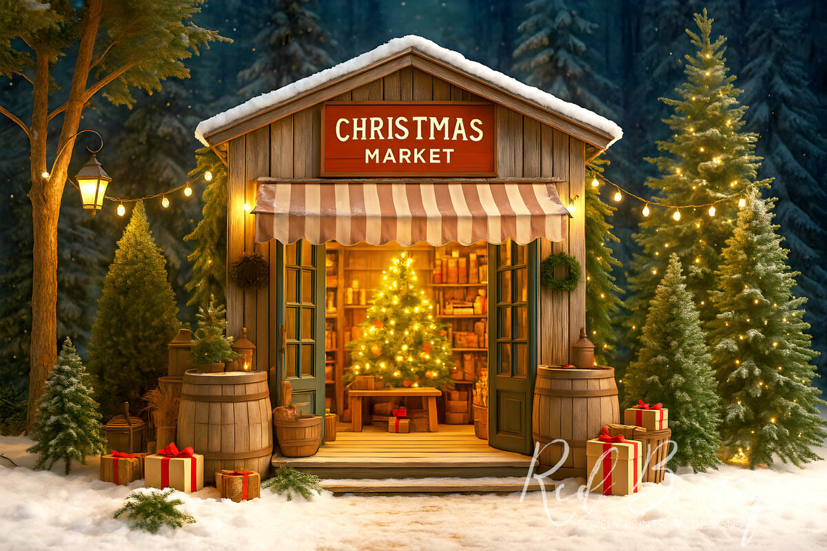 Fundal foto Christmas Market at Night pentru ședințe foto de Crăciun, cu un decor spectaculos de târg de sărbători. Decorul include o căsuță de lemn luminată, brăduți împodobiți, ghirlande cu lumini calde și cadouri așezate în față, oferind o atmosferă autentică de iarnă.