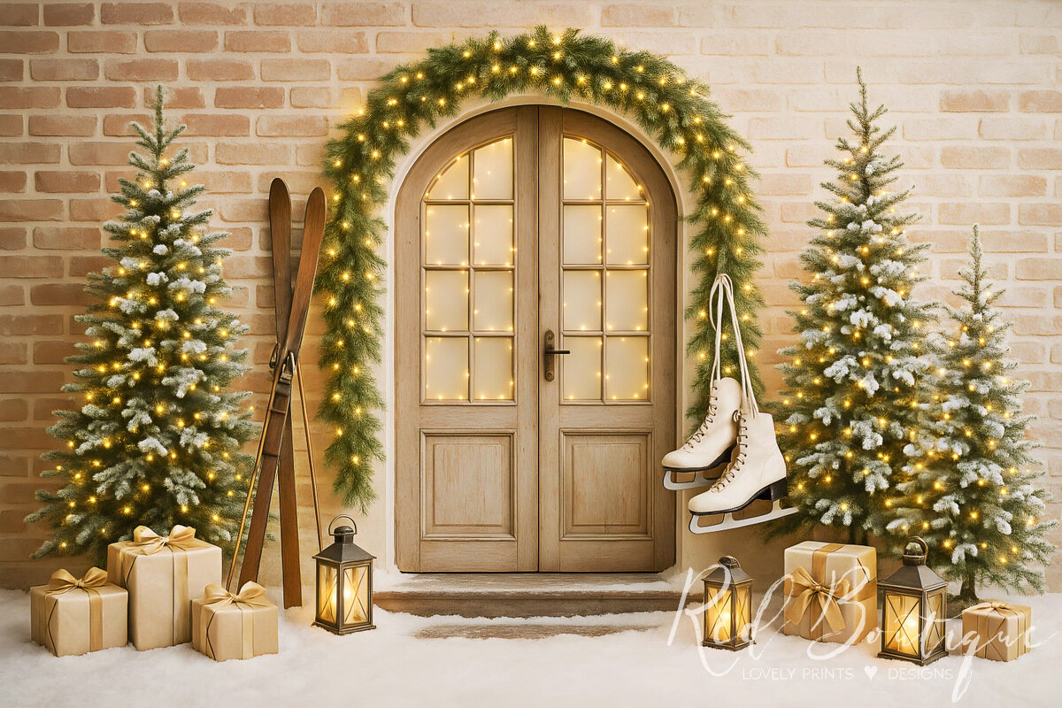 Fundal foto Golden Christmas Arch pentru ședințe foto de Crăciun, cu un decor cald și festiv. Decorul include o ușă arcuită încadrată de ghirlande luminoase, brazi ninși, cadouri aurii, felinare și elemente de iarnă precum patine și schiuri vintage.