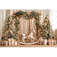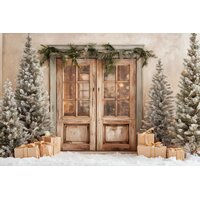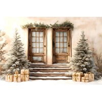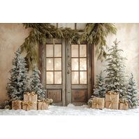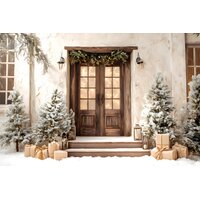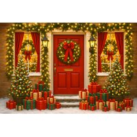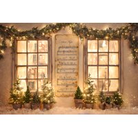 Fundal foto cu camera verde in stanga cu un semineu si o fereastra mare decorata cu ghirlande si funde rosii. Fundal cu o casa decorata de sarbatori. Pentru un decor de Craciun se pot adauga ornamente de brad, felinare, lumanari si crengute de brad, astfel ca veti crea un cadru potrivit unor sesiuni foto in studio pentru intreaga familie sau pentru fotografii cu copii.
