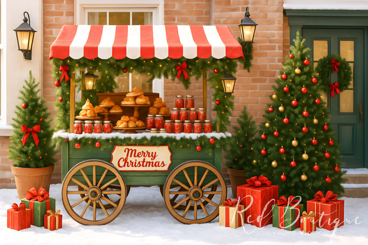 Fundal foto Holiday Bakery Cart pentru ședințe foto de Crăciun, decorat ca o mică brutărie festivă. Căruțul verde cu roți din lemn, acoperit cu ghirlande și o marchiză roșu-alb, este plin de bunătăți de sărbătoare – prăjituri, cornuri și borcane decorate. Decorul este completat de brazi împodobiți, cadouri colorate și felinare calde, oferind o atmosferă autentică de târg de Crăciun.