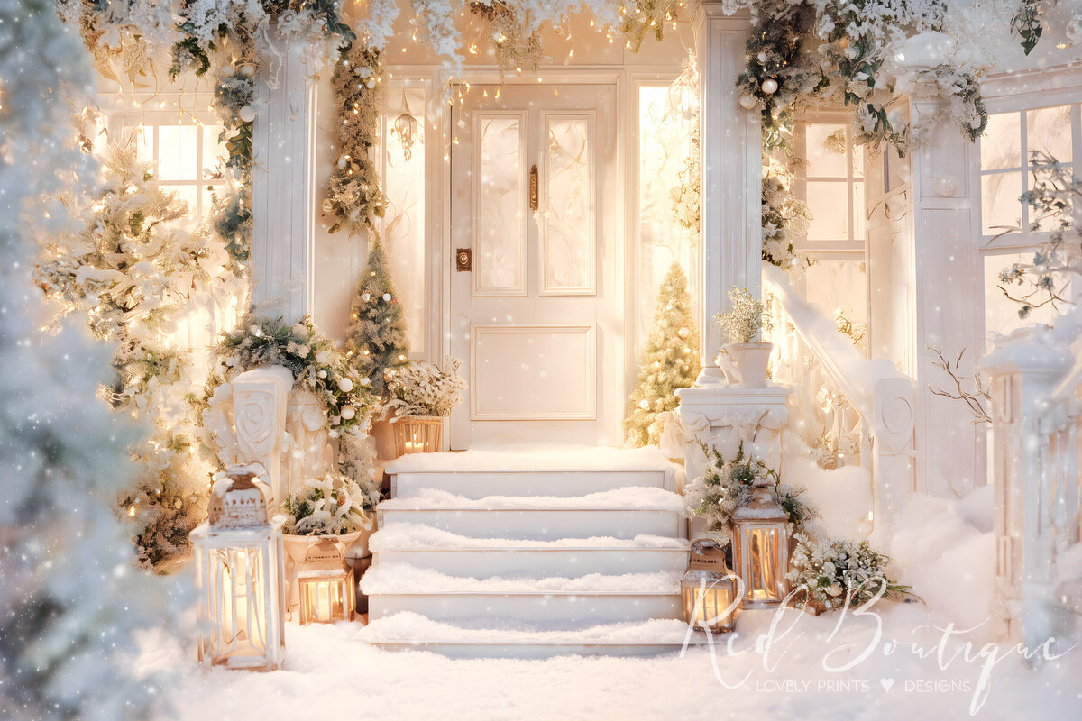 Fundal foto Holiday Entryway pentru ședințe foto de Crăciun, cu o intrare spectaculoasă decorată în alb și auriu. Scena include o ușă elegantă încadrată de ghirlande bogate, brazi împodobiți și felinare luminoase care creează o atmosferă feerică. Zăpada albă și luminile calde transformă acest decor într-o adevărată poveste de iarnă.