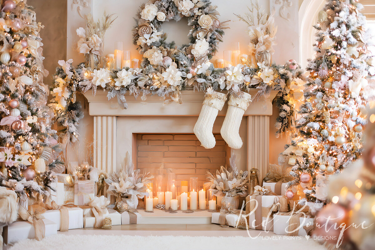 Fundal foto Magic Christmas Fireplace pentru ședințe foto de Crăciun, cu un decor elegant și festiv. Șemineul este împodobit cu o ghirlandă bogată, lumânări aprinse și ciorăpei de sărbători, iar deasupra se află o coroniță superbă. Decorul este completat de brazi împodobiți în nuanțe de alb, auriu și roz pudrat, precum și de cadouri luxoase aranjate la bază.
