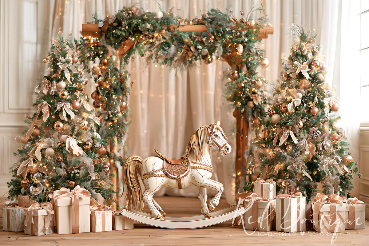 Fundalul foto Rocking Horse surprinde frumusețea clasică a Crăciunului într-o scenă elegantă și luminoasă. Decorul include un cal balansoar alb cu detalii aurii, plasat între doi brazi împodobiți cu ornamente rafinate în nuanțe de auriu și crem, un arc de verdeață cu lumini calde și numeroase cadouri frumos ambalate. Atmosfera este caldă, luxoasă și festivă, perfectă pentru ședințe foto de familie, copii sau cadre profesionale de sezon.