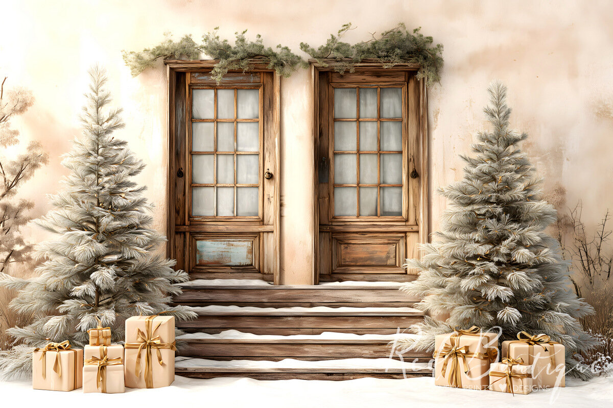 Fundalul foto Rustic Double Doors Snow surprinde frumusețea iernii într-un decor autentic și natural. Cele două uși din lemn vechi, decorate cu crengi verzi, sunt încadrate de brazi acoperiți de zăpadă și cadouri aurii, creând un cadru festiv, dar rustic.