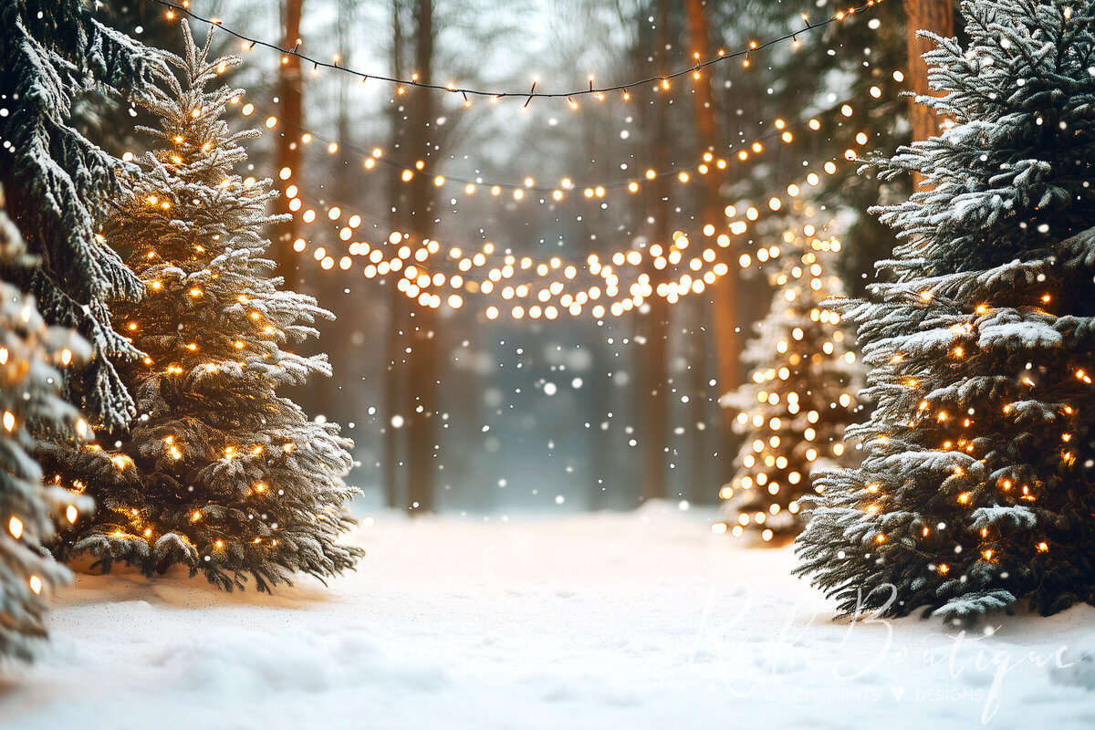 Fundalul "Twinkle Snow Trees" oferă un decor magic și feeric pentru ședințele foto de iarnă. Brazii acoperiți cu zăpadă, împodobiți cu luminițe calde, creează o atmosferă de poveste în mijlocul pădurii, iar ghirlandele luminoase suspendate între copaci adaugă un efect fermecător de strălucire. Zăpada proaspăt căzută, cu fulgi care dansează ușor în aer, transformă acest fundal într-un cadru perfect pentru fotografiile de Crăciun, oferind o senzație de liniște și bucurie. Este ideal pentru capturarea momentelor speciale alături de cei dragi, într-un decor de vis