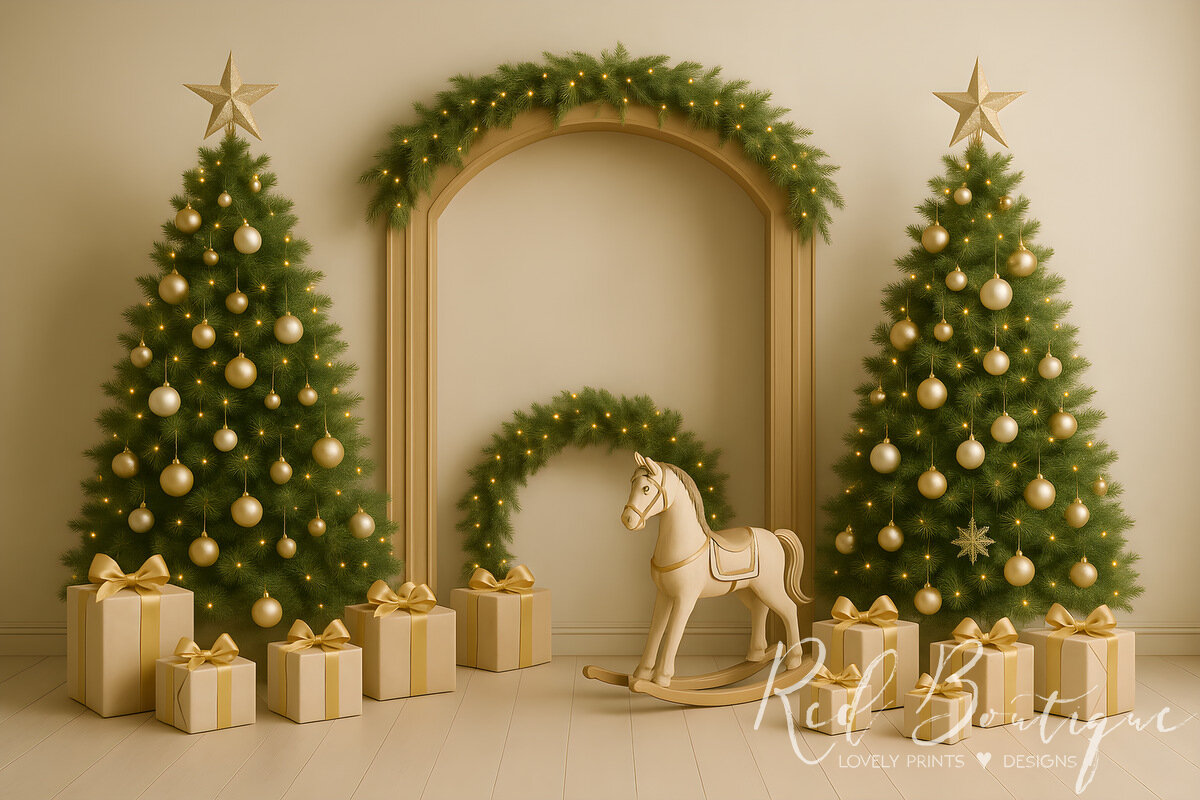 Fundal foto Warm Christmas pentru ședințe foto de Crăciun, decorat cu tonuri calde și elegante. Decorul include doi brazi împodobiți cu globuri aurii, o arcadă festivă cu ghirlandă și un cal de lemn decorativ, înconjurat de cutii cadou aurii. Atmosfera este caldă, luminoasă și elegantă, perfectă pentru fotografii de familie, copii sau portrete de sărbători.
