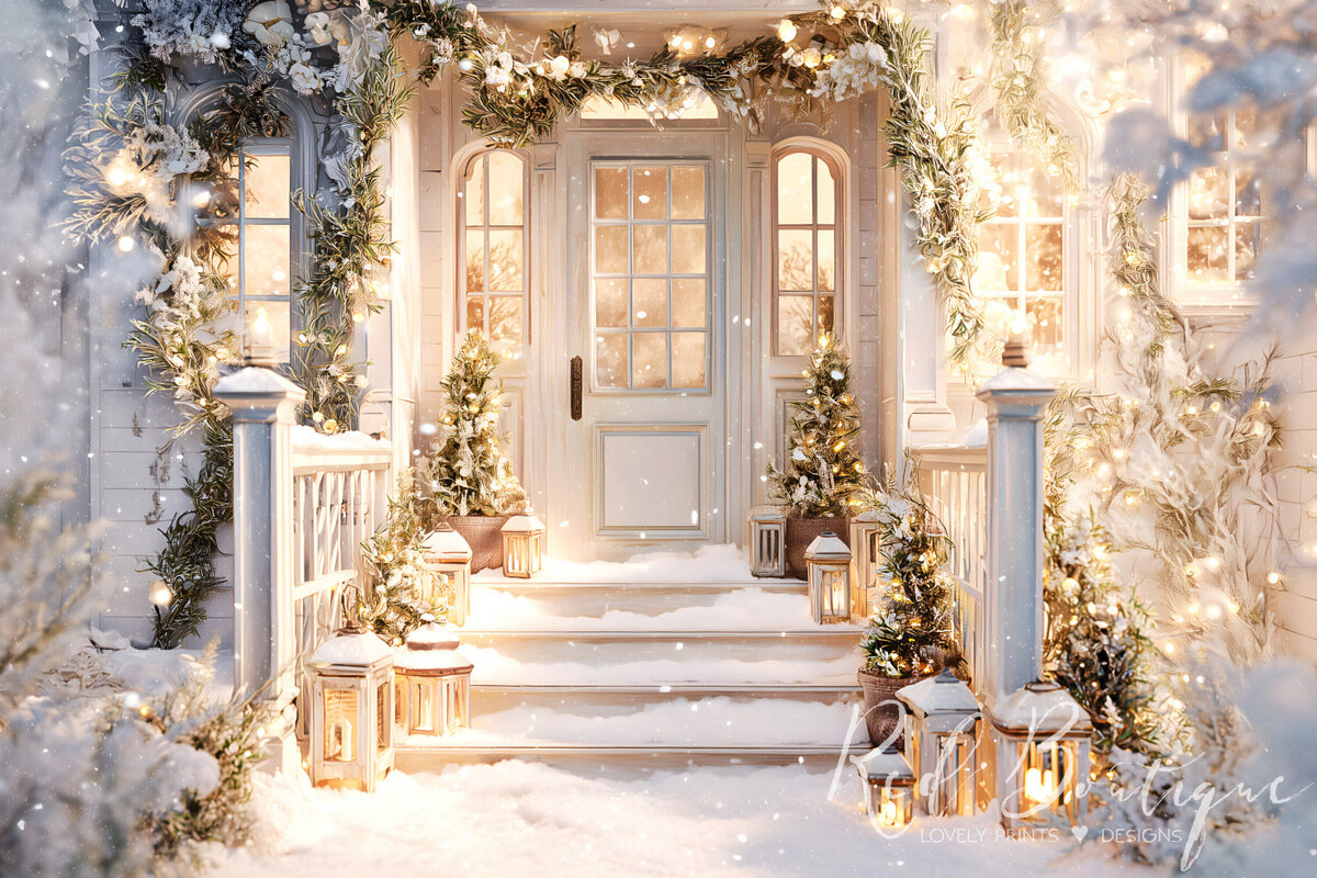 Fundal foto Whimsical White Christmas pentru ședințe foto de Crăciun, decorat cu un aer de basm. Intrarea luminoasă este împodobită cu ghirlande albe, mini brazi împodobiți și felinare aprinse care dau o atmosferă caldă și festivă. Zăpada artificială și luminițele delicate completează cadrul, creând o scenă feerică, perfectă pentru fotografii memorabile.
