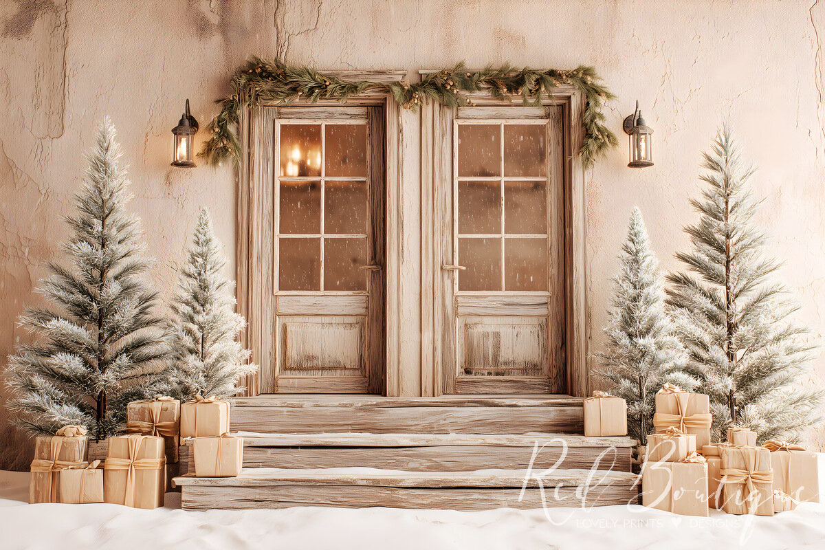 Fundal foto Wood Doors and Trees pentru ședințe foto de Crăciun, cu un decor rustic și elegant. Două uși din lemn vechi, înconjurate de brazi ninși și cadouri aurii, creează o atmosferă autentică de iarnă.