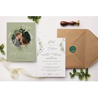 Invitatia propriu-zisa se poate realiza pe un carton simplu, sau pentru un plus de eleganta cu un print folio auriu. In loc de clasicul plic, acest model va fi accesorizat cu o foaie de calc cu design floral si un sigiliu de ceara.
